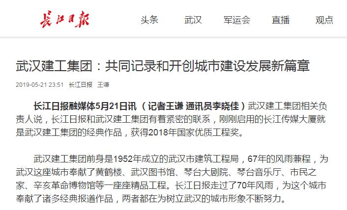 長(zhǎng)江日?qǐng)?bào)融媒體5月21日訊 (記者王謙 通訊員李曉佳)武漢建工集團(tuán)相關(guān)負(fù)責(zé)人說,長(zhǎng)江日?qǐng)?bào)和武漢建工集團(tuán)有著緊密的聯(lián)系,剛剛啟用的長(zhǎng)江傳媒大廈就是武漢建工集團(tuán)的經(jīng)典作品,獲得2018年國(guó)家優(yōu)質(zhì)工程獎(jiǎng)。